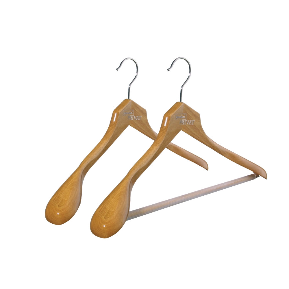 Der Formbügel PRIVAT aus massivem, poliertem Buchenholz überzeugt durch eine verstärkte Schulter, welche die perfekte Passform für Ihre Kleidung bietet. Den Garderobenbügel gibt es mit und ohne rutschfestem Kleidersteg.