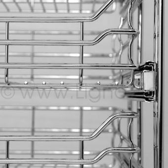 Das System ist für alle Schränke mit Türen nachrüstbar, Türscharniere stören beim öffnen der Vollauszug-Drahtkörbe nicht.