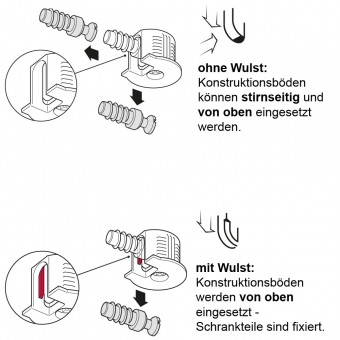 - mit Wulst = Die Konstruktionsböden werden von oben eingesetzt; die Schrankteile sind vorfixiert.
