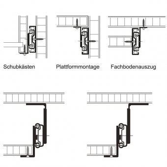 Bitte beachten Sie, dass der Einsatz erst ab einer Führungslänge von 350 mm beim Vollauszug und 400 mm beim Teilauszug möglich ist.