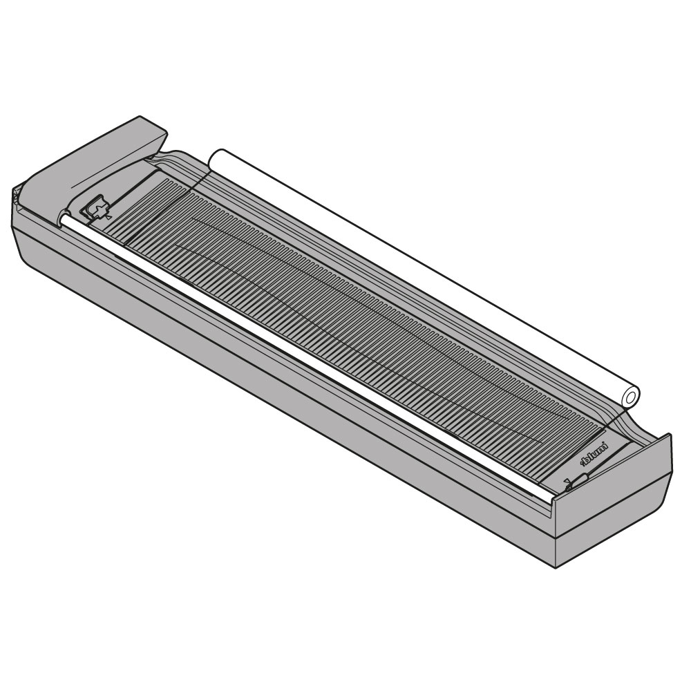 Das Hantieren mit Klarsichtfolien wird mit diesem praktischen Folienschneider erheblich erleichtert. Die Küchenfolie lässt sich mit dem Blum-Folienstab faltenfrei herausziehen und weiterverarbeitenl; somit wird das lästige Verkleben der abgetrennten Folienteile verhindert.
