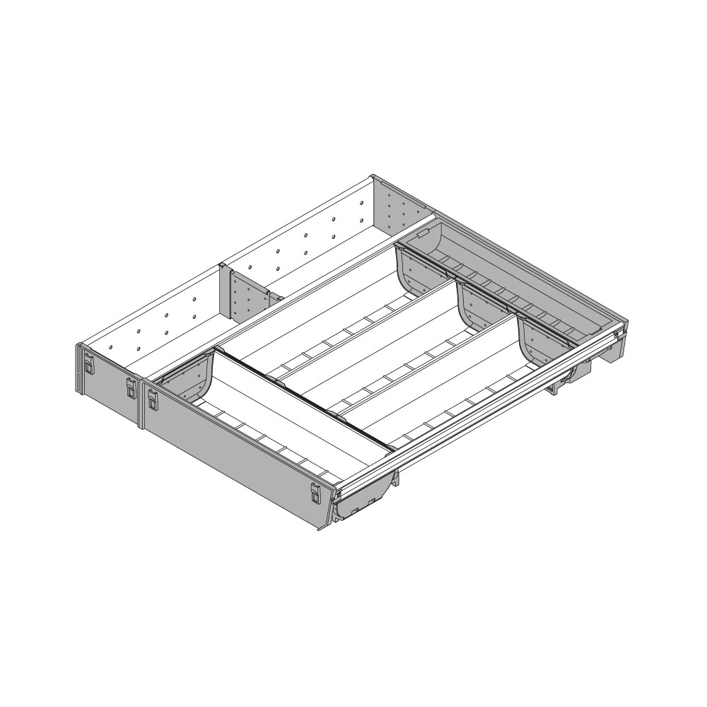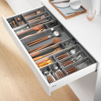 Die Inneneinteilungssysteme von ORGA-LINE sind Sets, die den gesamten Schubkasten ausfüllen. Sie nutzen den Stauraum optimal und sind exakt auf die unterschiedlichen Staugüter abgestimmt. Für hohe Staugüter im Frontauszug werden Längs- und Querteiler, für niedrige Staugüter werden Schalen und Facheinteilungen eingesetzt.