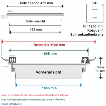 Für Schubladenbreite (Korpusbreite KB) / -Innenbreite = bestehend aus: