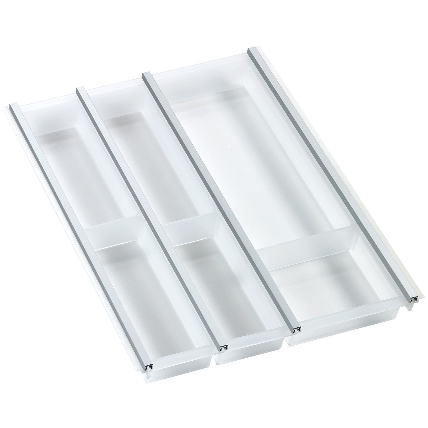 Die intelligente Stecktechnik ermöglicht zudem eine flexible Anpassung an unterschiedliche Schubkastenbreiten. Innerhalb der einzelnen Schalen können mittels versetzbarer Trennstege individuell Unterteilungen vorgenommen werden. Angepasst an alle marktgängigen Schubladen ermöglichen die individuellen Besteckeinsätze flexible Organisationsmöglichkeiten im Innenbereich. Cuisio ermöglicht es Ihnen, den gesamten Schubkasten oder nur einen Teilbereich der Schublade zu organisieren. Die einzelnen, transparenten Kunststoff-Schalen mit einer Höhe von 55 mm werden durch ein Aluminiumprofil so miteinander verbunden, dass sie zu einer Einheit werden.