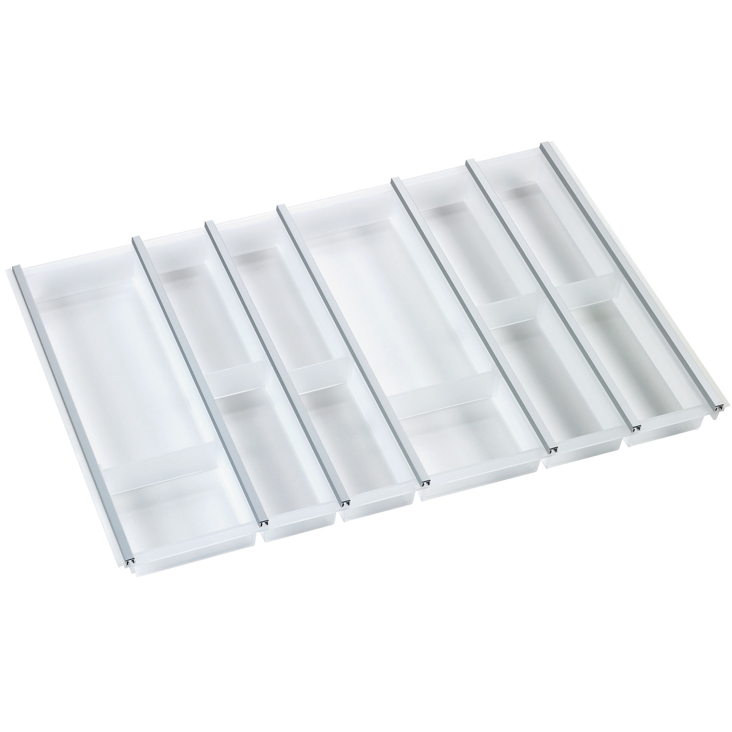 Die intelligente Stecktechnik ermöglicht zudem eine flexible Anpassung an unterschiedliche Schubkastenbreiten. Innerhalb der einzelnen Schalen können mittels versetzbarer Trennstege individuell Unterteilungen vorgenommen werden. Angepasst an alle marktgängigen Schubladen ermöglichen die individuellen Besteckeinsätze flexible Organisationsmöglichkeiten im Innenbereich. Cuisio ermöglicht es Ihnen, den gesamten Schubkasten oder nur einen Teilbereich der Schublade zu organisieren. Die einzelnen, transparenten Kunststoff-Schalen mit einer Höhe von 55 mm werden durch ein Aluminiumprofil so miteinander verbunden, dass sie zu einer Einheit werden.