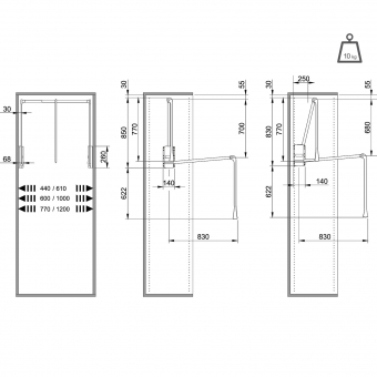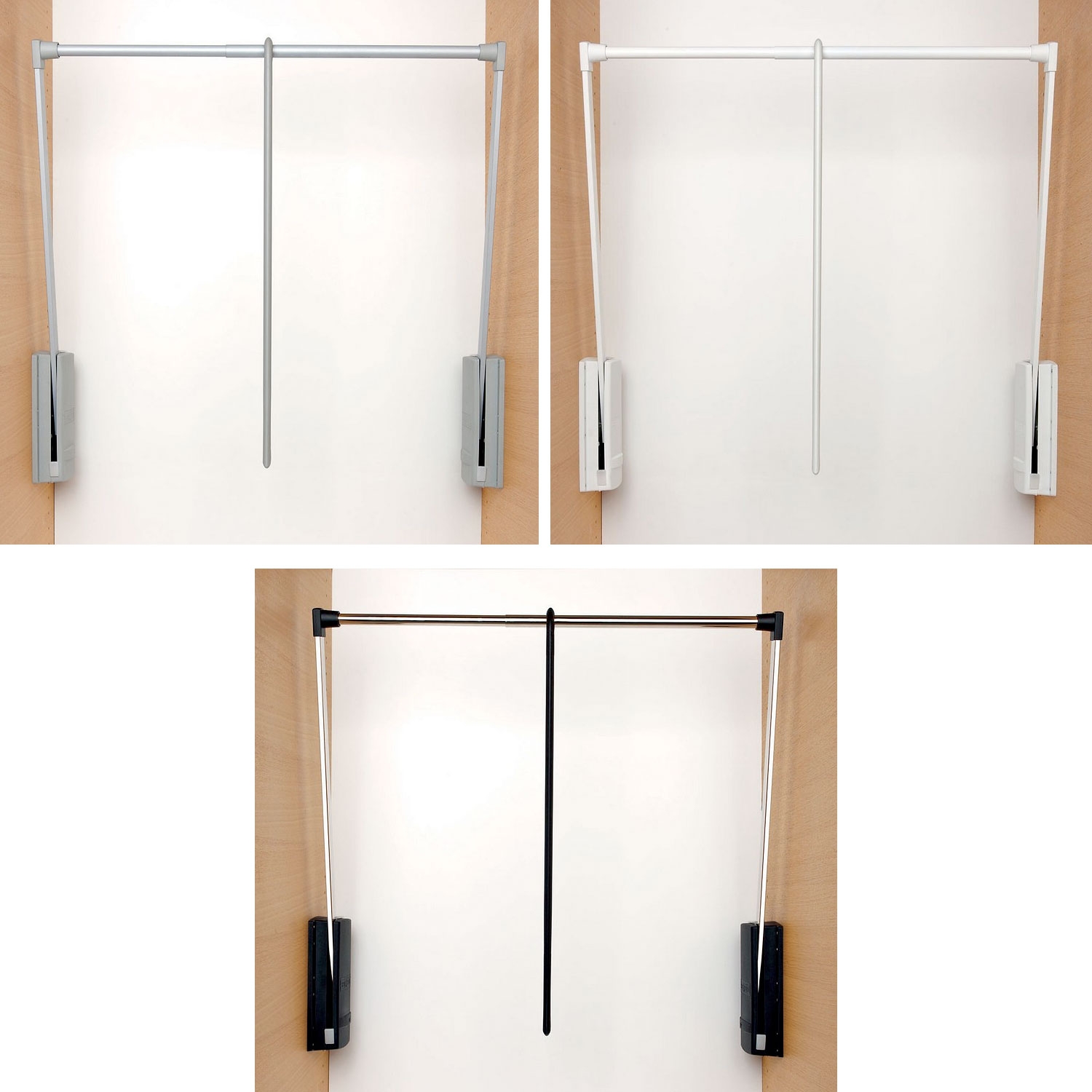 Zum technischen Steckbrief des Kleiderlifters gehören beidseitige Anbindung, Teleskop - Breitenverstellung für lichtes Korpusmaß 450 bis 600mm , 600 -830 mm und 830 - 1200 mm, Auszieh-Stange und Montage im System 32. Türeinsprünge oder angeschlagene Auszugsysteme werden mittels eines Distanzstückes überwunden.