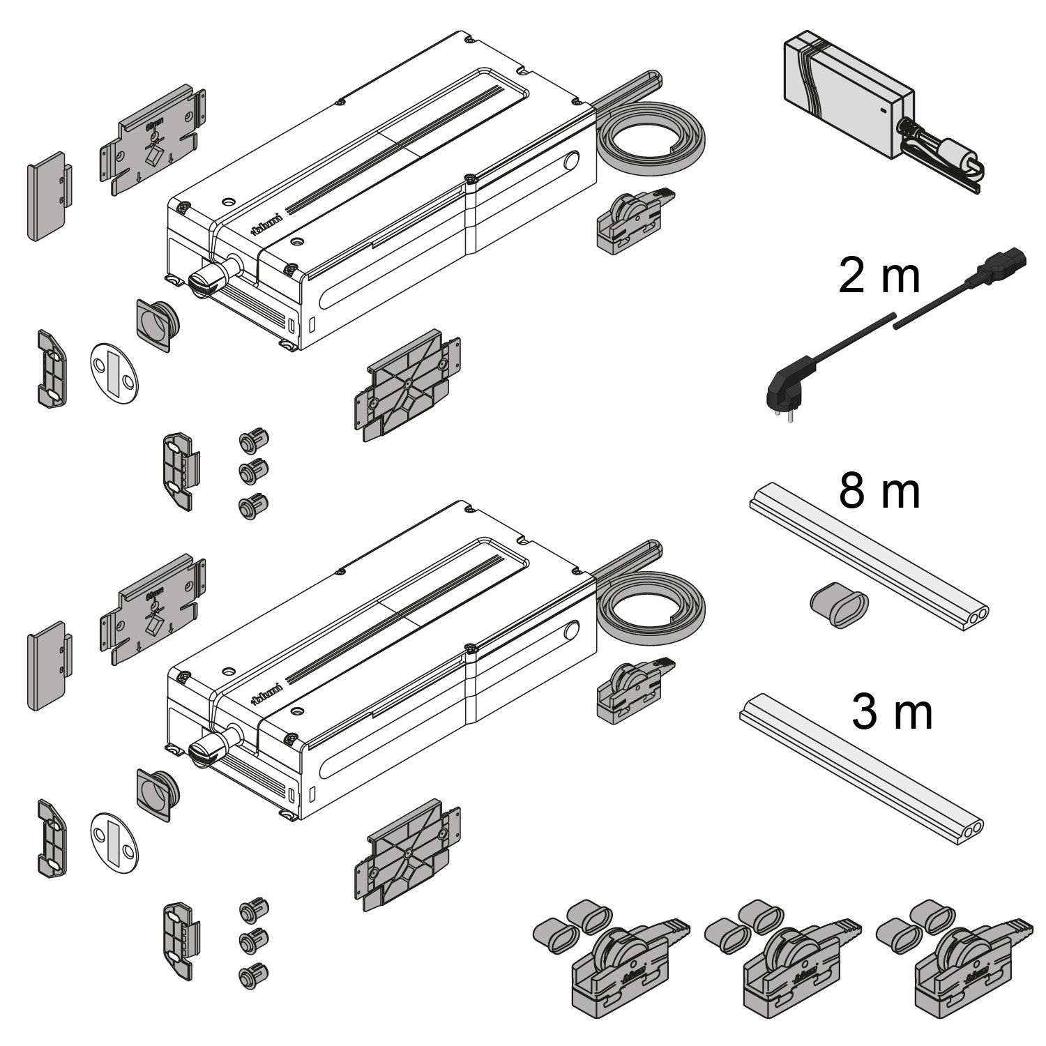 - 2 SD flex Sets - 1 Netzgerät - 1 Kabel 2 m - 1 Verteilerkabel 3 m - 1 Verbindungskabel 8 m - 3 Verbindungsknoten