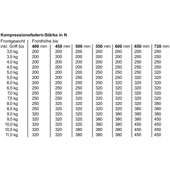 Federkraft: 150 N / 200 N / 250 N / 320 N / 380 N / 450 N / 500 N / 550 N / 600 N