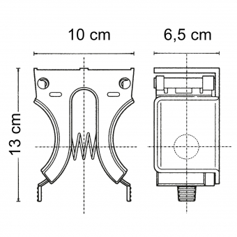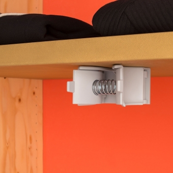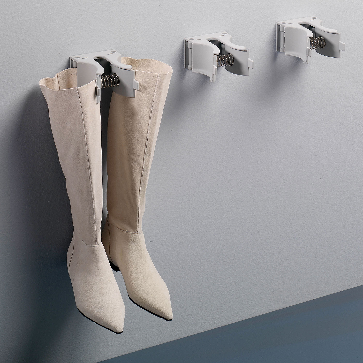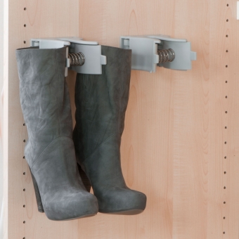 Der Stiefelhalter wird an der Wand oder unter einem Ablagebrett im Innern eines Möbelfachs montiert und ist in der Lage, Stiefel oder Stiefeletten jedes Typs und jeder Größe aufzunehmen.