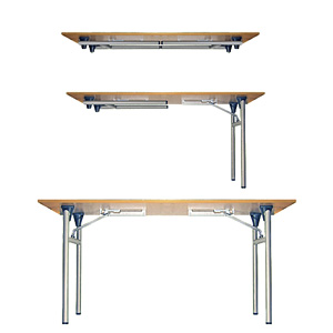 Die platzsparenden Klapptischgestelle aus Stahl, sind zusammengeklappt stapelbar und ruckzuck aufgebaut.