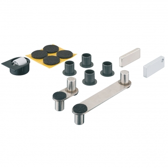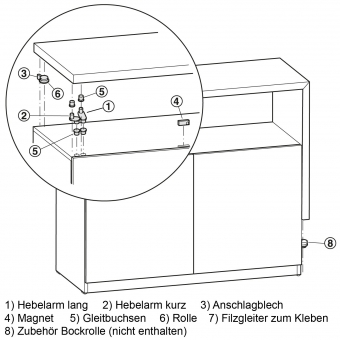 - - 1 Hebelarm lang - 1 Hebelarm kurz - 1 Anschlagsblech - 1 Magnet - 4 Gleitbuchsen - 1 Rolle - 4 Filzgleiter - Montageanleitung