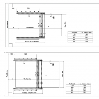 - max. Ansatzplatte 600 mm - nötiges Innenmaß 700 mm (zw. Tischfüßen)