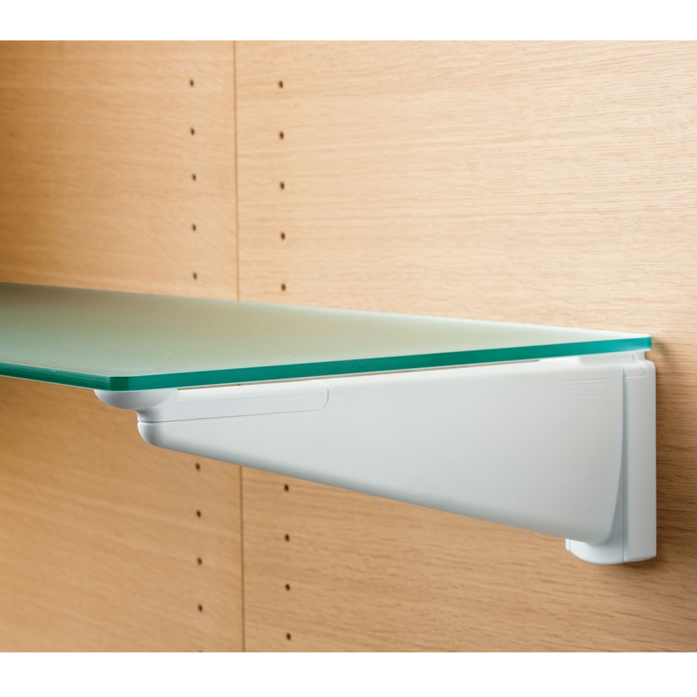 Das Trägerelement für Tablare aus Holz oder Glas besteht aus Kunststoff und ist in den Farben Schwarz und Grau erhältlich. Die Breite beträgt 300 mm, die Höhe 112 mm.