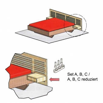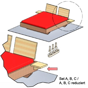 Die selbstspannende Konus-Verbindung weist zudem höchste Stabilitätseigenschaften auf. Bei einer einfachen Einhänge-Lösung greifen zwei bis sieben Dübel mit konisch geformten Enden in schlüsselförmige, hinterfräste Öffnungen ein und verbinden Bettseite und Haupt- bzw. Fußteil sicher und lösbar miteinander.