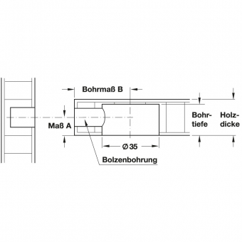 Bohrmaß B: Abstand von Maxifix-Gehäusemitte bis Vorderkante Tablar 35 / 55 mm (abhängig vom gewähltem Bolzen)