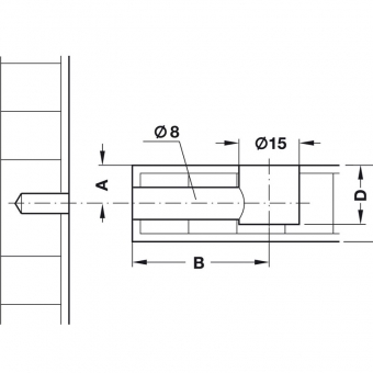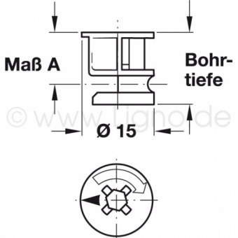 Bohrmaß B: Abstand von Minifix-Gehäusemitte bis Vorderkante 24 / 34 mm (abhängig vom gewähltem Bolzen)