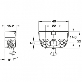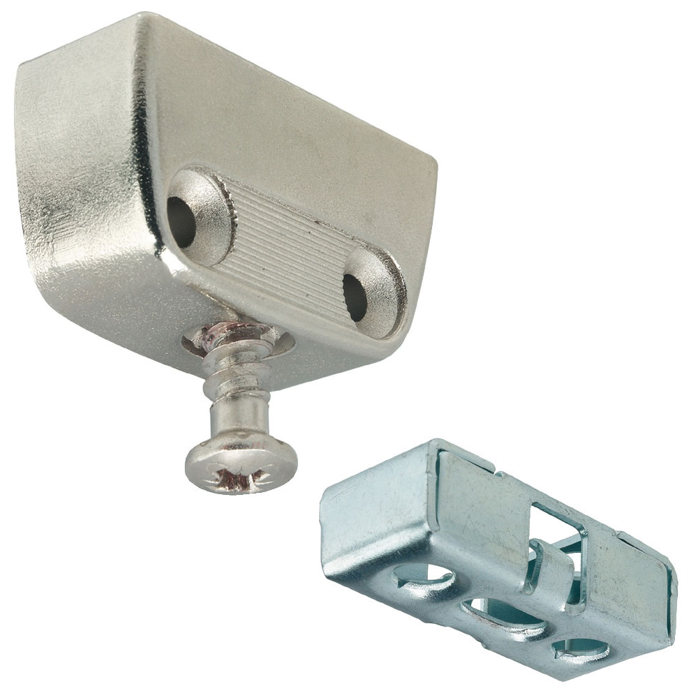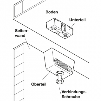 Der Möbelverbinder RV mit Rastfunktion besteht aus einem Oberteil und einem Unterteil (mit Toleranzausgleich ±1,5 mm). Beim Zusammenfügen der Möbelkomponenten rastet das Unterteil in das Oberteil ein und ist damit vorfixiert.
