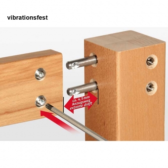 Das extra starke Verbindungssystem aus Stahl – für Tische, Stühle, Betten und viele andere Möbel – ist für Plattenstärken von 20 bis 30 mm geeignet. Das 15 mm Gehäuse zieht durch das Eindrehen einer Madenschraube den Bolzen (Durchmesser 10 mm) sicher bis zu 4,5 mm an. Toleranzen in den Bohrpositionen oder Plattendicken können so ausgeglichen werden.