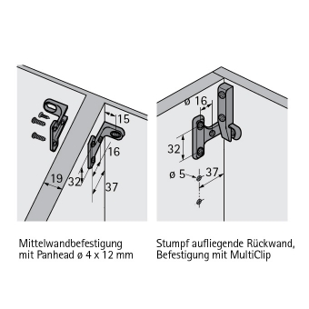 - Konstruktionswinkel einsetzbar im Rastersystem 32, Höhenverstellung +/- 1 mm