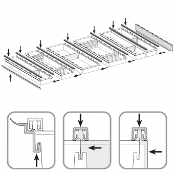 Das Unterteilungs-System cuisio ermöglicht es Ihnen, den gesamten Schubkasten oder nur einen Teilbereich zu organisieren. Die einzelnen, transparenten Kunststoff-Schalen werden durch ein Aluminiumprofil so miteinander verbunden, dass sie zu einer Einheit werden. Passend für Blum-TANDEMBOX Länge 500 mm, für Korpusbreiten von 300 mm bis 1200 mm.