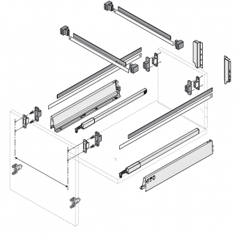 Zubehör zu Artikel-Nr. 84346430000 und 84346433000 = Blum 320Mxx00C und 330MxxxPC METABOX Frontauszug-Grundelement (nicht im Lieferumfang enthalten).
