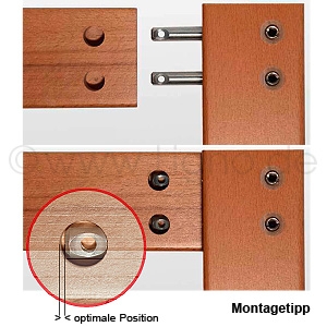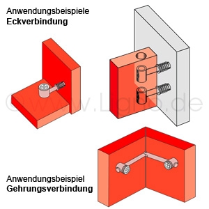 Das extra starke Verbindungssystem aus Stahl – für Tische, Stühle, Betten und viele andere Möbel – ist für Plattenstärken von 20 bis 30 mm geeignet. Das 15 mm Gehäuse zieht durch das Eindrehen einer Madenschraube den Bolzen (Durchmesser 10 mm) sicher bis zu 4,5 mm an. Toleranzen in den Bohrpositionen oder Plattendicken können so ausgeglichen werden.