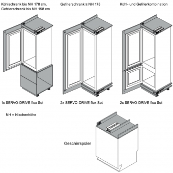 Türen von Kühl- und Gefrierkombis werden jeweils mit einer eigenen SERVO-DRIVE flex-Einheit ausgestattet und können damit separat geöffnet werden. Große und schwere Türen öffnen mit zwei synchronisierten Antriebseinheiten zeitgleich. Bei integrierten Geschirrspülern wird die Einheit mittig in der Einbaunische montiert.
