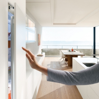 Öffnen der Gerätetüre durch Antippen der Front, diese öffnet per Stößelhub und bleibt für 2 Sekunden geöffnet stehen. In dieser Zeit kann die Türe bequem komplett geöffnet werden. SERVO-DRIVE flex passt sich den Eigenschaften der Tür an. So ist der Zugriffsspalt immer gleich groß und die Tür kann zuverlässig geöffnet werden.